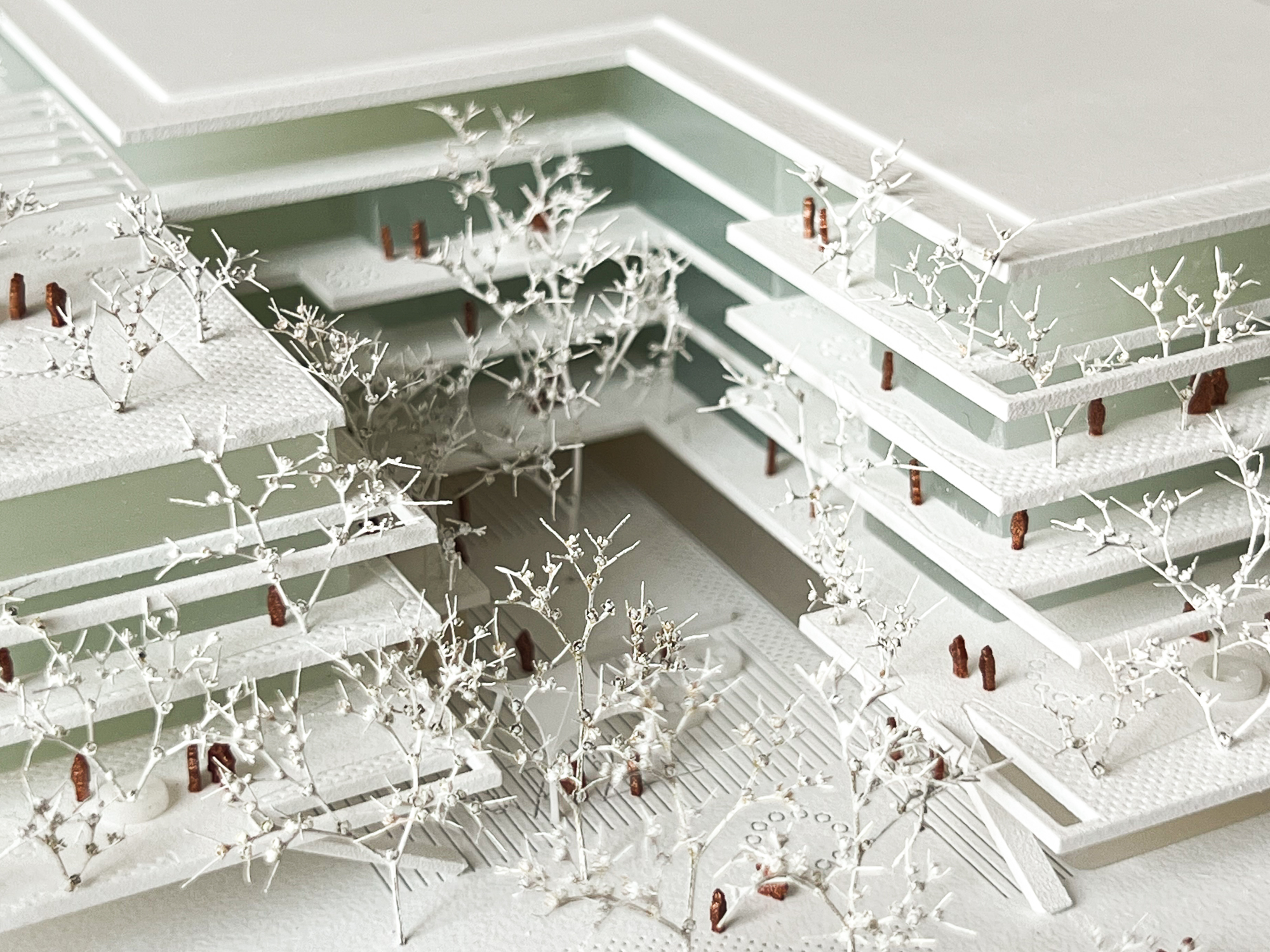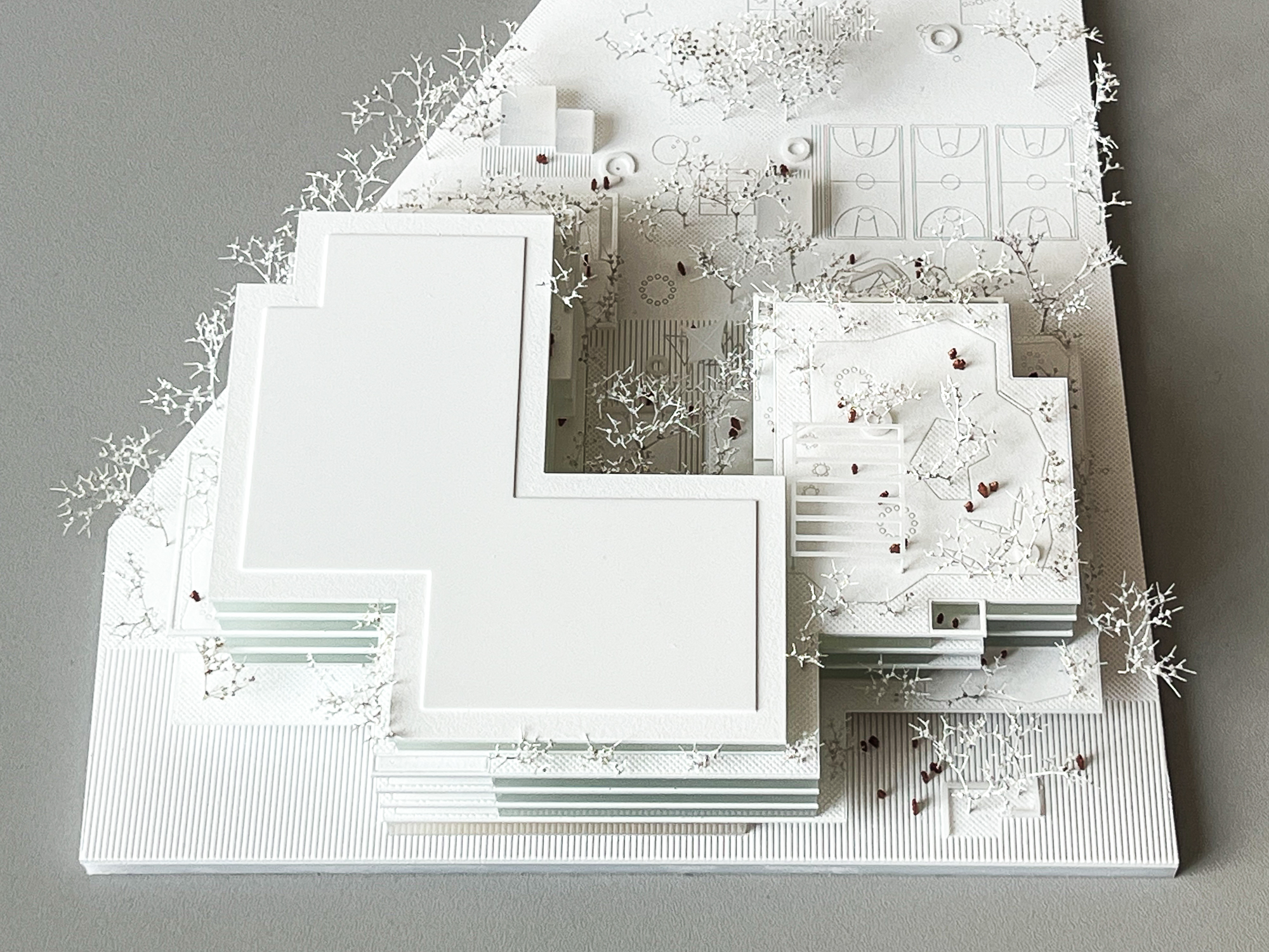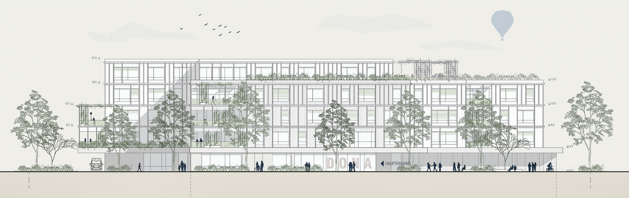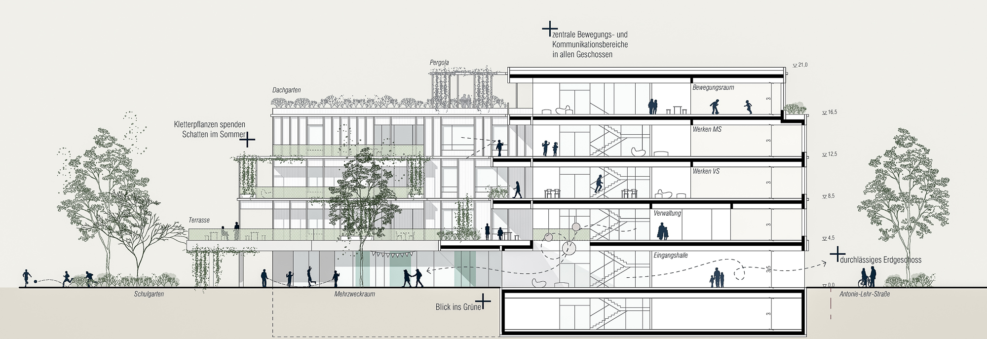 Vor- und Rücksprünge ziehen sich über das gesamte Schulgebäude, dadurch verzahnt sich der Freiraum mit dem Volumen: Schulgarten, Balkone, Terrassen, Loggien und Pergolen bilden Freiräume auf allen Ebenen für alle möglichen Nutzungen – wie chillen, lernen, lesen, spielen, diskutieren, gemeinsam oder allein arbeiten, sporteln, sich zurückziehen. Das Miteinander von allen Kindern muss in unterschiedlichen Settings möglich sein und ist ausschlaggebend für Akzeptanz, Respekt und Toleranz – die Schule als Ort an dem soziale Fähigkeiten durch ein vielfältiges Raumangebot gefördert werden. Eine ausgewogene Morphologie und eine angemessene Kleinteiligkeit entsteht ebenfalls durch die Strukturierung des Baukörpers, der trotzdem sehr kompakt ist.