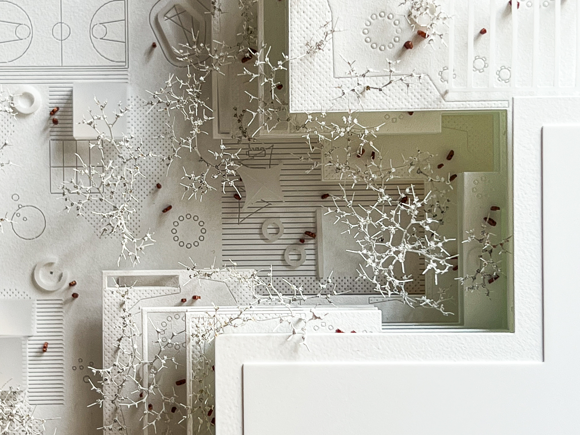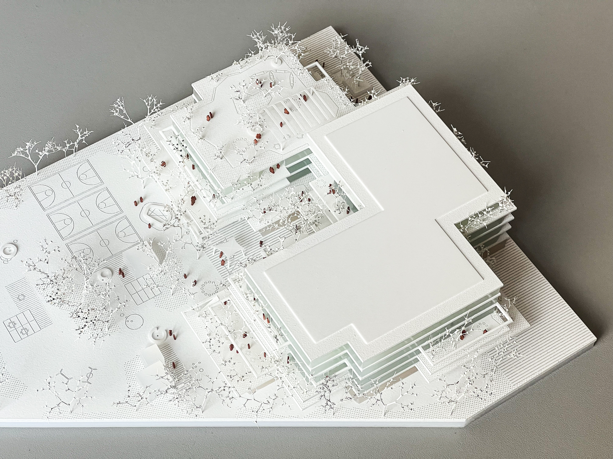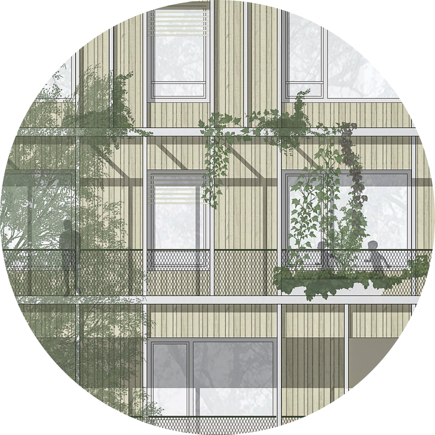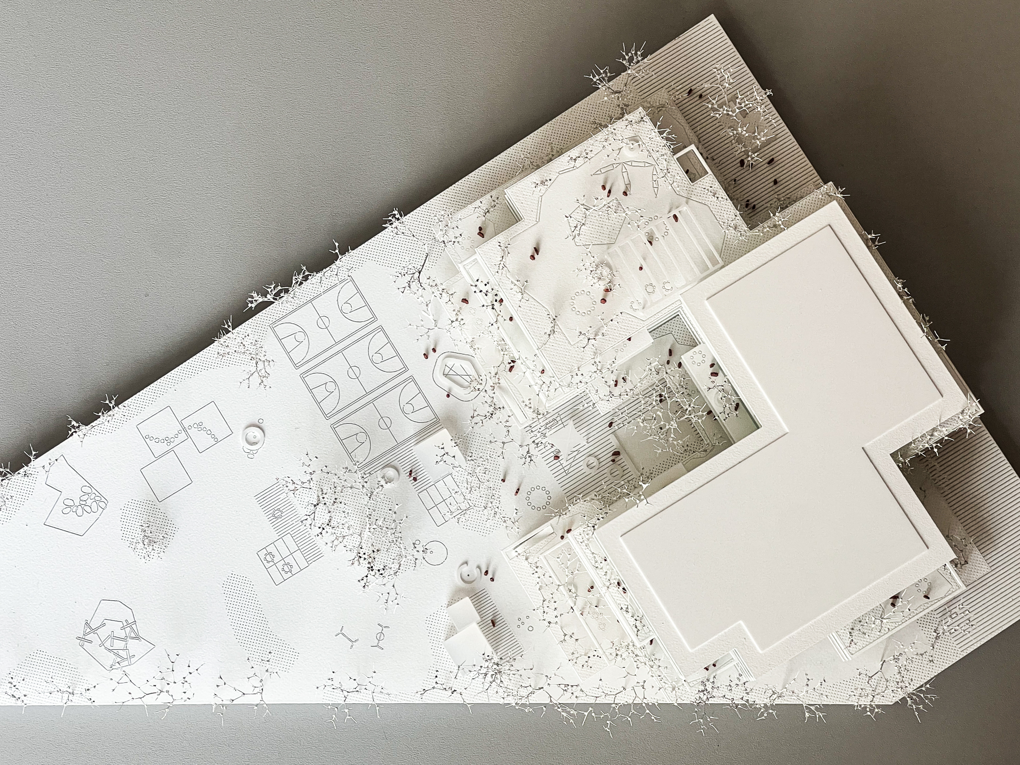 Vor- und Rücksprünge ziehen sich über das gesamte Schulgebäude, dadurch verzahnt sich der Freiraum mit dem Volumen: Schulgarten, Balkone, Terrassen, Loggien und Pergolen bilden Freiräume auf allen Ebenen für alle möglichen Nutzungen – wie chillen, lernen, lesen, spielen, diskutieren, gemeinsam oder allein arbeiten, sporteln, sich zurückziehen. Das Miteinander von allen Kindern muss in unterschiedlichen Settings möglich sein und ist ausschlaggebend für Akzeptanz, Respekt und Toleranz – die Schule als Ort an dem soziale Fähigkeiten durch ein vielfältiges Raumangebot gefördert werden. Eine ausgewogene Morphologie und eine angemessene Kleinteiligkeit entsteht ebenfalls durch die Strukturierung des Baukörpers, der trotzdem sehr kompakt ist.