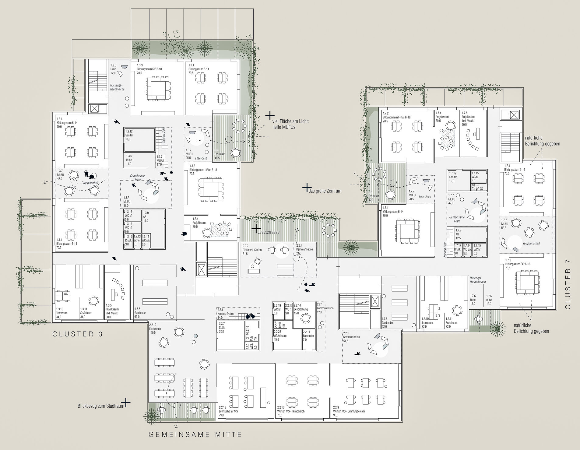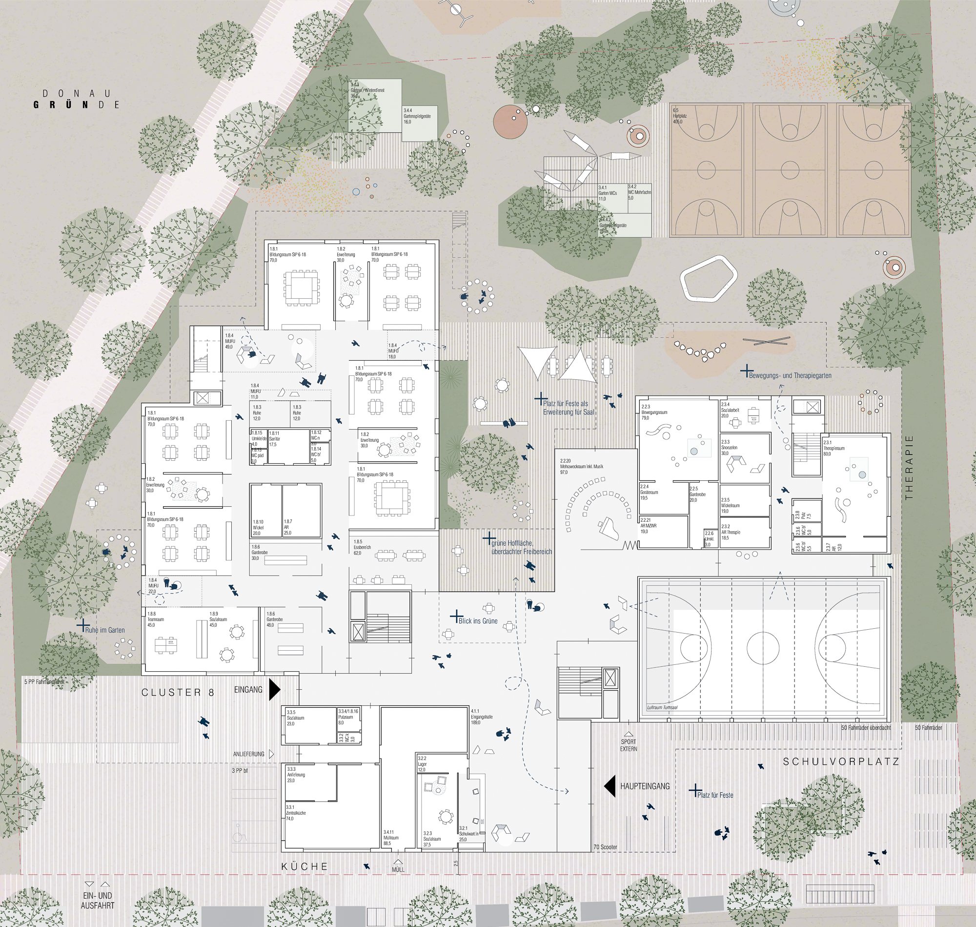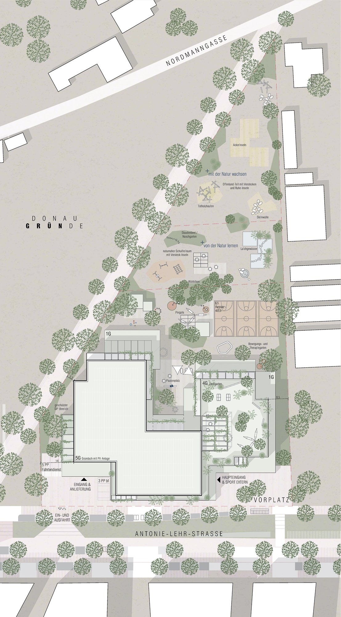 Vorrangiges Entwurfsziel war Minimaler Fußabdruck und Maximaler Freiraum mit unterschiedlichen Bespielungsmöglichkeiten für alle Altersstufen zu generieren und den Freiraum für die Wechselkröten in den Schulfreiraum zu integrieren.
